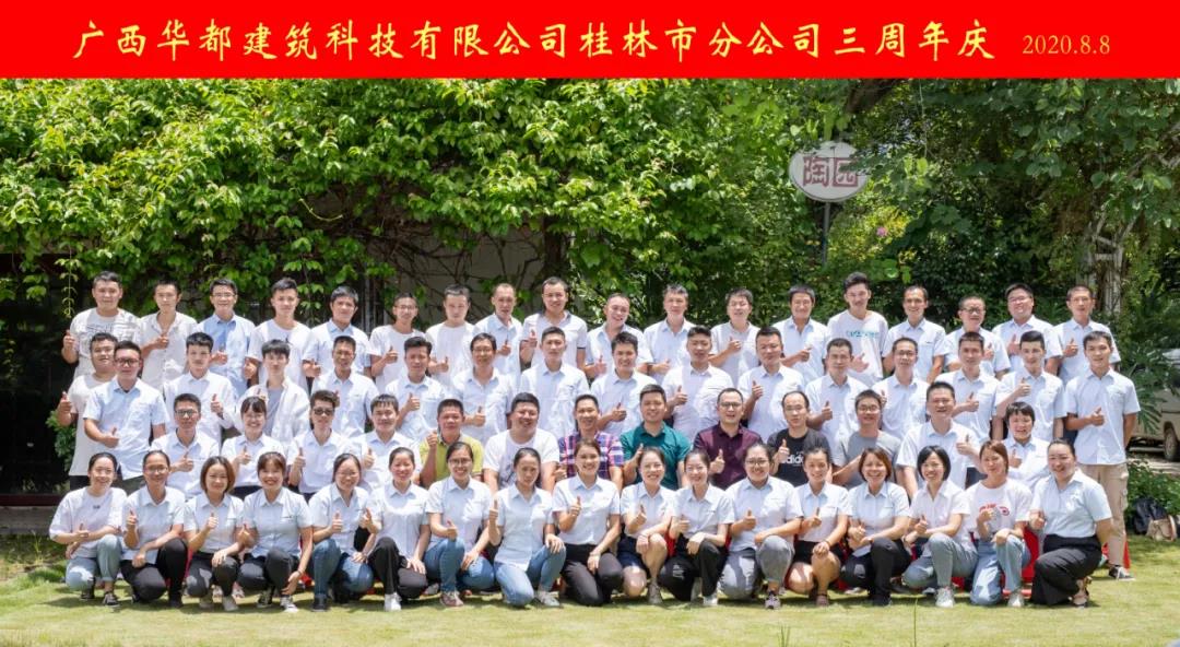 廣西華都建筑科技有限公司桂林市分公司成立三周年了。2020年8月8日,公司董事、公司總部領(lǐng)導(dǎo)以及分公司全體員工前往桂林市‘世外桃源’舉辦廣西華都建筑科技有限公司桂林市分公司三周年慶典活動(dòng)。